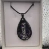 Elegant teardrop pendant with black and purple design. Features a unique metallic accent. Comes with a black cord.